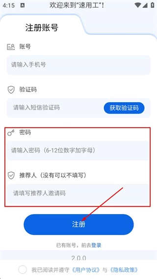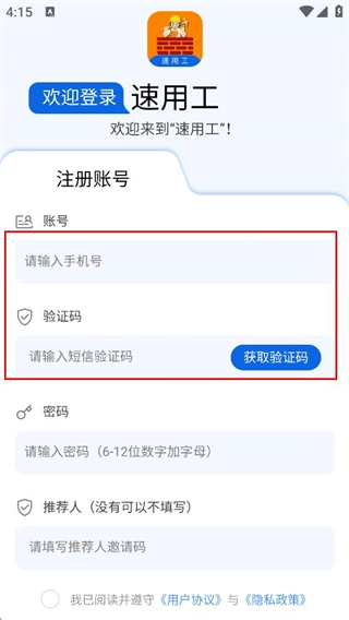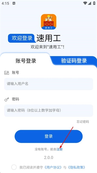 在速用工的登录页面,找到“没有账号,前去注册”选项并点击,即可进入注册账号页面。
