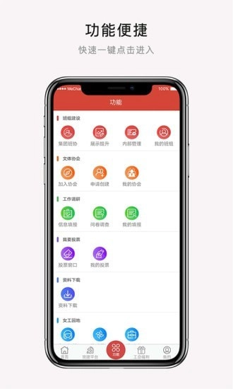 功能选择方面,职工在应用首页能够依据自身需求挑选对应的功能模块,像公告、问卷调查、投票之类的都包含在内。