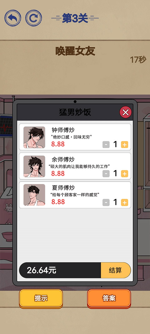 5、点击手机,选择猛男炒饭,下单三个帅哥的炒饭,点击结算。