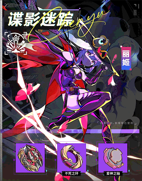 “谍影迷踪”的誓灵是一位身份成谜、隐于夜行服之下的刺客,名为丽姬。拥有一双美丽的眼睛,只有黑夜知晓她的狠戾。手中的利刃从不指向弱势者,是一位心怀大义的侠客。