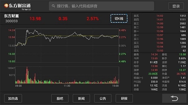 东方财富通TV版是东方财富网依托自身平台研发的免费炒股软件,该软件操作简便、界面友好、功能完备、资讯丰富,且支持动态交互。这款免费炒股软件覆盖沪深主板、全球商品期货及外汇等各类金融市场行情数据,堪称综合全面、性能卓越的顶级免费炒股工具。