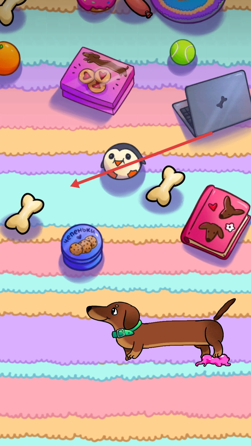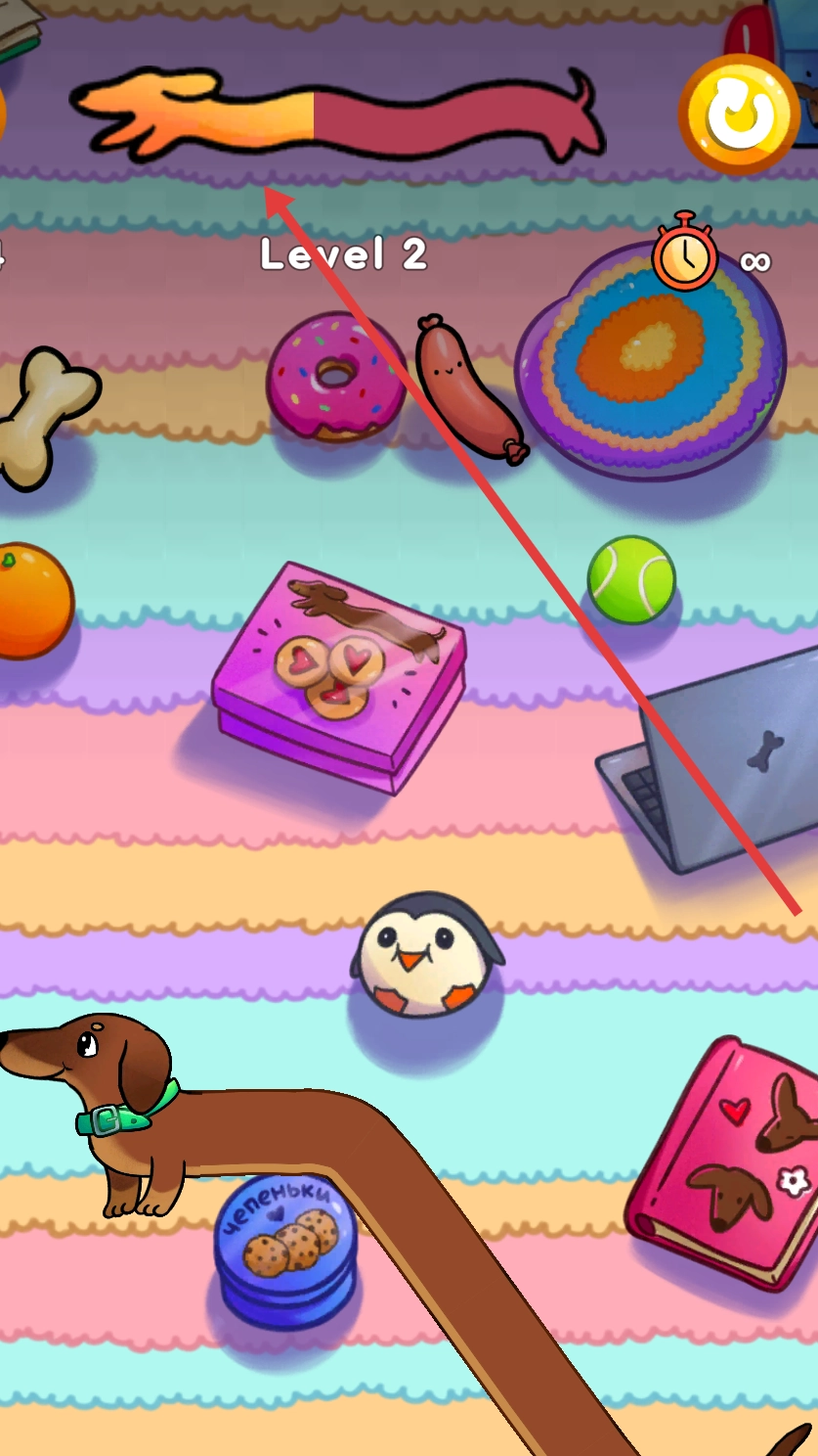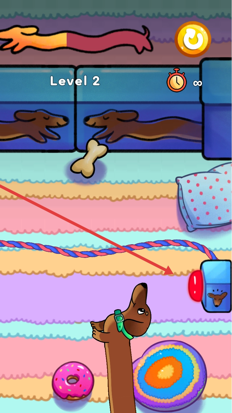 上方的黄色条状物显示着小狗还剩下的身体长度,它能让小狗把身体拉长,去够高处的骨头、香肠之类的物品,从而推动游戏进度。