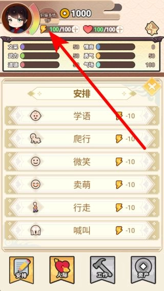 在安排界面可以选择学习技能,比如学语、爬行之类的,不过学习需要消耗体力,得在体力充足的时候进行,要合理规划体力来提升角色能力。