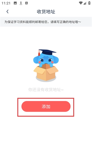 在【收货地址】页面,要是还没有地址,点击【添加】按钮,就能进入新建收货地址的填写界面。