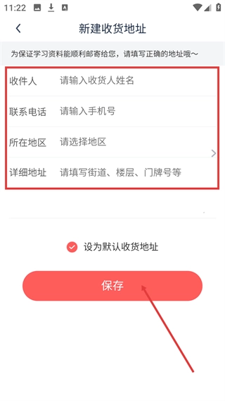 进入【新建收货地址】页面,把收件人、联系电话等信息填写好,再点击【保存】按钮,就能完成地址添加操作了。
