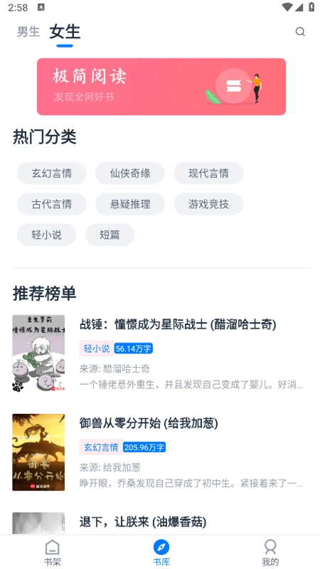 挑选书籍:你可以在应用里浏览或者搜索想读的书。极简阅读注重简洁,因此分类或许不会太繁杂,不过书源很充足,你大概率能找到自己感兴趣的内容。