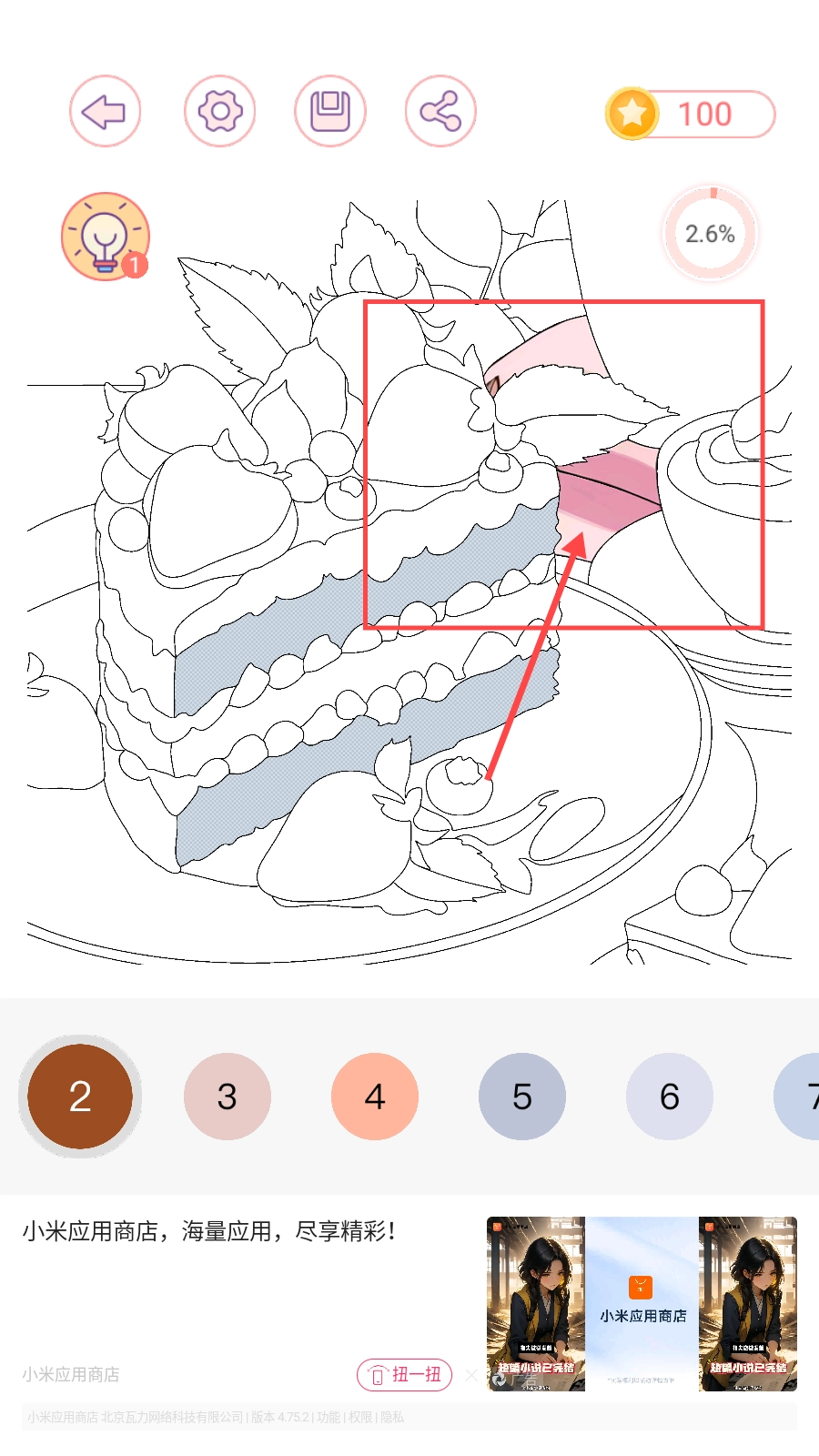 点击下方【1】按钮,即会出现需要涂色的区域。