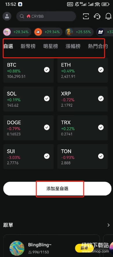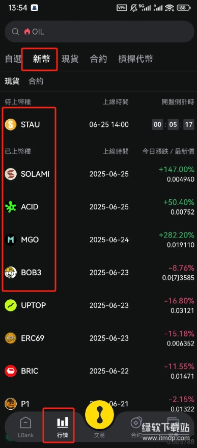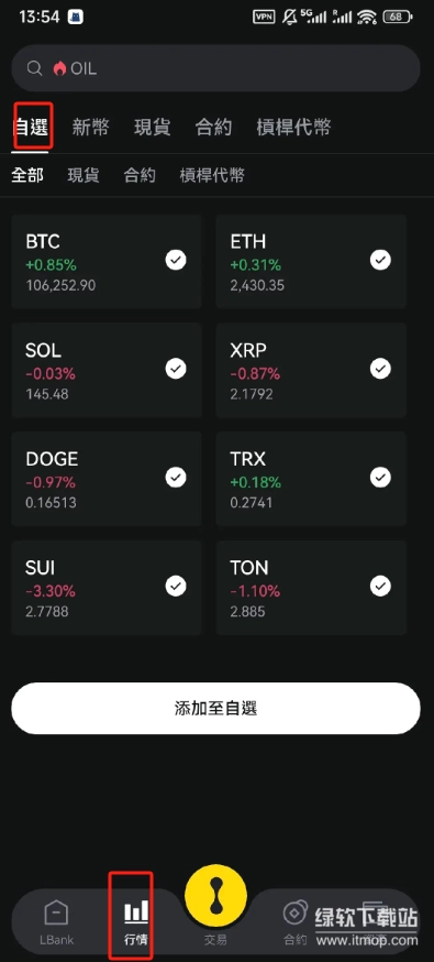 行情页面包含自选、新币、现货、合约等功能