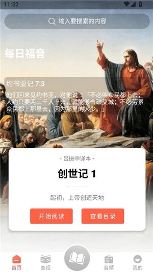 听读圣经时如何搜索书籍呢?具体操作如下:首先在当前页面进行圣经的听读,之后打开并进入对应的应用程序。