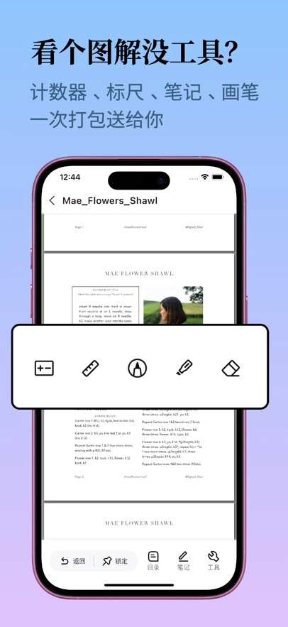在PDF阅读模式下,配备了多种实用的编织辅助工具,如画笔、荧光笔、橡皮、标尺和编织计数器等。画笔与荧光笔能协助您标注关键内容,橡皮可用来清除误标痕迹;标尺多用于提花图,助力您确定当前编织所处行数;编织计数器便于您记录针数与行数,使编织过程更精准。
