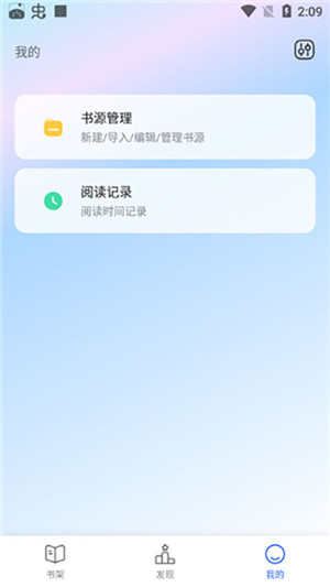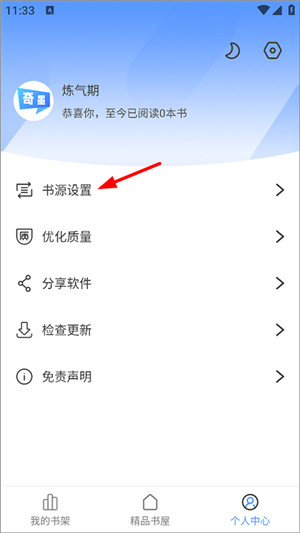 2、在个人中心页面,用户进行阅读设置、优化书籍质量,点击书源设置;