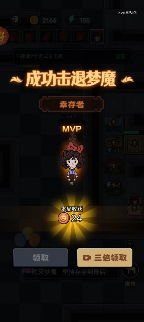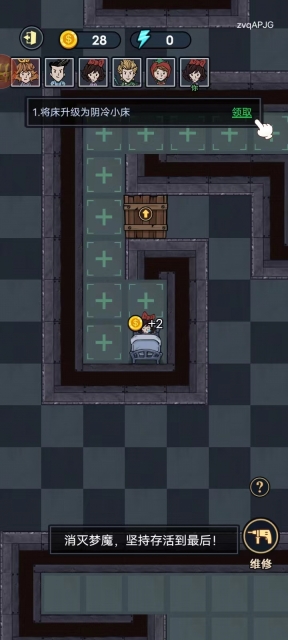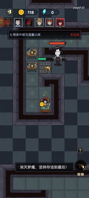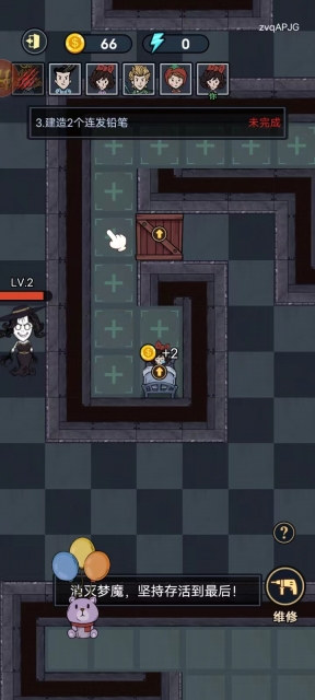 7、点击房间的空地,可以建造连发铅笔或老式发电机;建造老式铅笔可以在梦魇来袭时进行攻击;随着游戏进程的推进,梦魇会逐渐变强,因此玩家需要不断升级老式铅笔和大门,以击退梦魇。