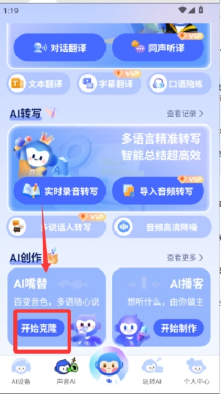 要是想试试人工智能语音克隆或者智能配音,你可以在对应的板块里按照提示录一段样本语音,系统会学习这个声音然后生成专属的个人声音模型,之后就能用这个模型来合成指定文本的语音了。