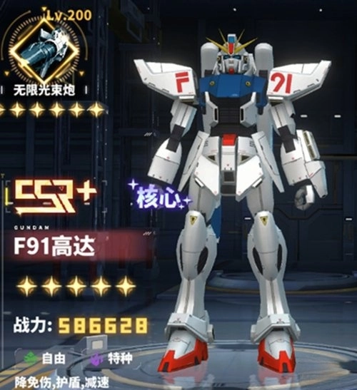 一技能能50%概率降低3个敌人25%的免伤效果,这里给新手解释一下:免伤属于很珍贵的属性,它涵盖了物理、能量以及异常伤害的免伤,所以降低25%免伤是个强度很高的技能。大家要把控好速度节奏,让F91高达先出手降低对方免伤,接着让输出机体进行爆发攻击,就能打出高额伤害,切记一定要给F91高达配备迅捷芯片。