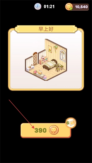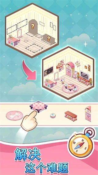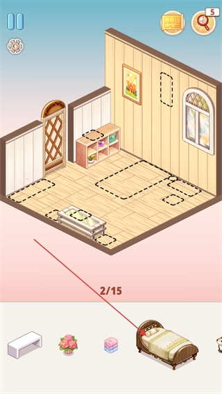 在关卡挑战时,我们得拖动下方的家具,把它们摆到合适的地方,以此完成房间的拼装。