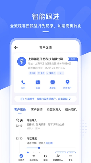 客户动态智能跟进功能,可全景式记录客户信息与行为轨迹,通过动态追踪助力商机快速转化。