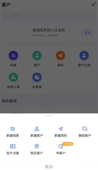 在客户页面,点击右上角“+”,选择【找客户】。