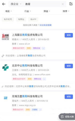 点击企业名称即可查看该企业的详细信息,点击页面上的【一键领取】按钮,就能获取相关的联系方式。