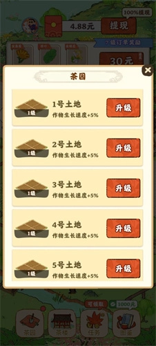 土地等级每提升一级,茶叶种子的生长速度就会加快5%,这样能节省不少时间,方便进行更多操作。