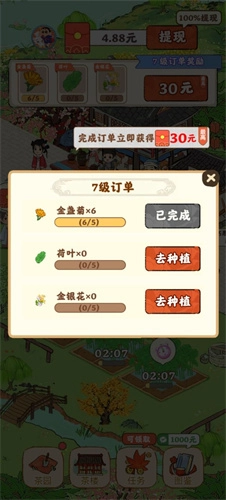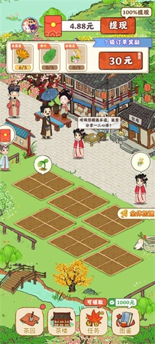 茶香乐园是一款以茶叶种植为核心的休闲经营类游戏。在游戏中,玩家每日都能在专属土地上播撒不同品种的茶叶种子,经过短暂等待后即可收获成熟茶叶,从而获取丰厚奖励;此外,若顺利完成系统发布的订单任务,还能额外领取红包福利。