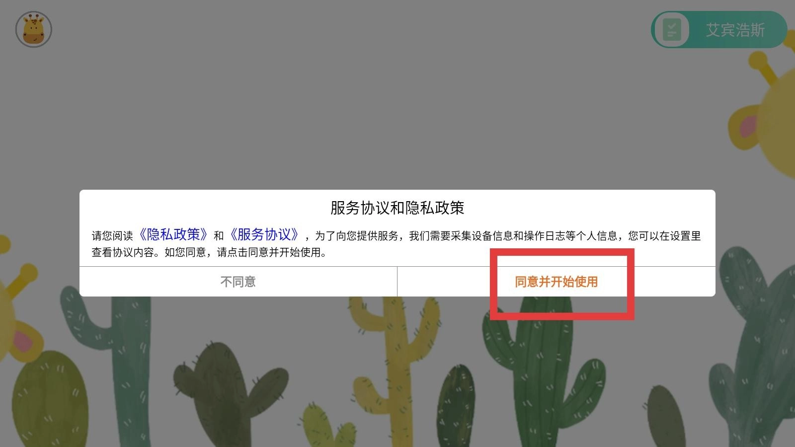 进入四五认字软件后,会弹出服务协议,仔细阅读软件提供的建议,点击同意就能继续后续操作。