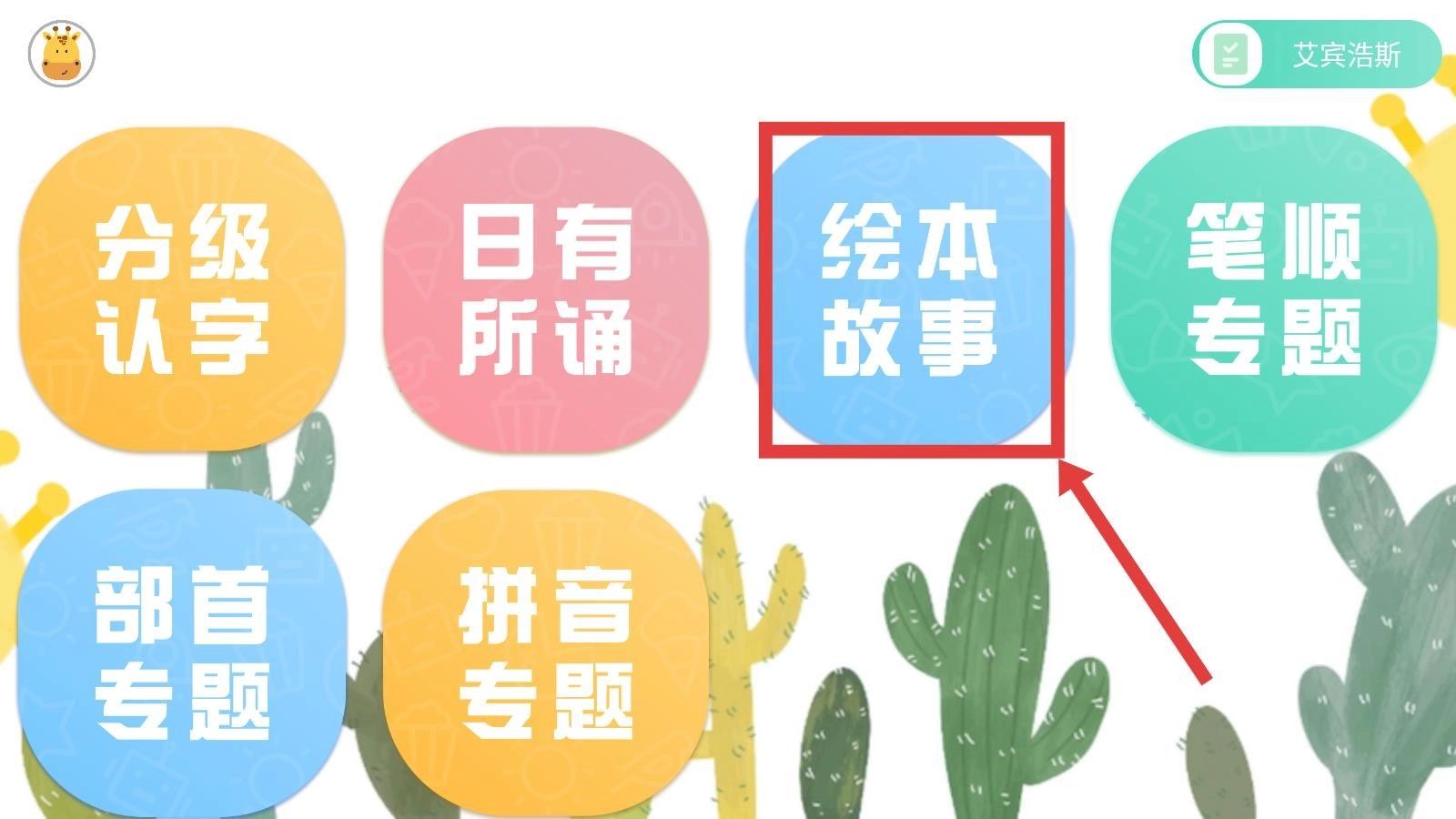 进入后续界面后,按照箭头指示把目光转向右上角,找到“故事绘本”选项并点击,即可进入与故事相关的界面。