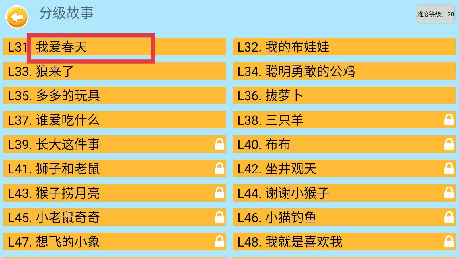 进入故事选择界面后,能直接选择想听的故事,像“我的布娃娃”“我爱春天”这类,选定后就能开始收听了。