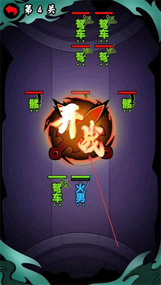 在第4关开启前,先查看敌方阵容里的弩车、骷髅等单位,以及己方阵容的弩车、火勇、爆龟,随后点击开战按钮进入战斗。