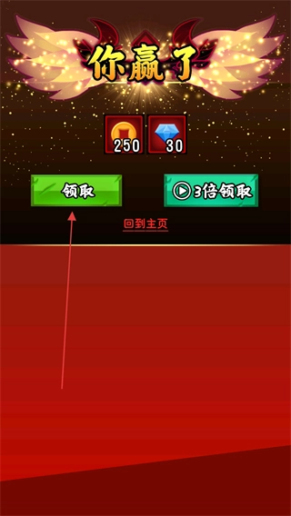 在消灭所有敌方单位后,你就能赢得胜利,并获得金币与钻石奖励。此时你可以点击领取来获取这些奖励,或者选择3倍领取以获得更多资源,这些资源可用于提升己方角色的实力。