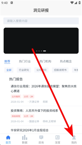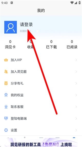 在洞见研报首页,点击底部我的,进入个人页面。