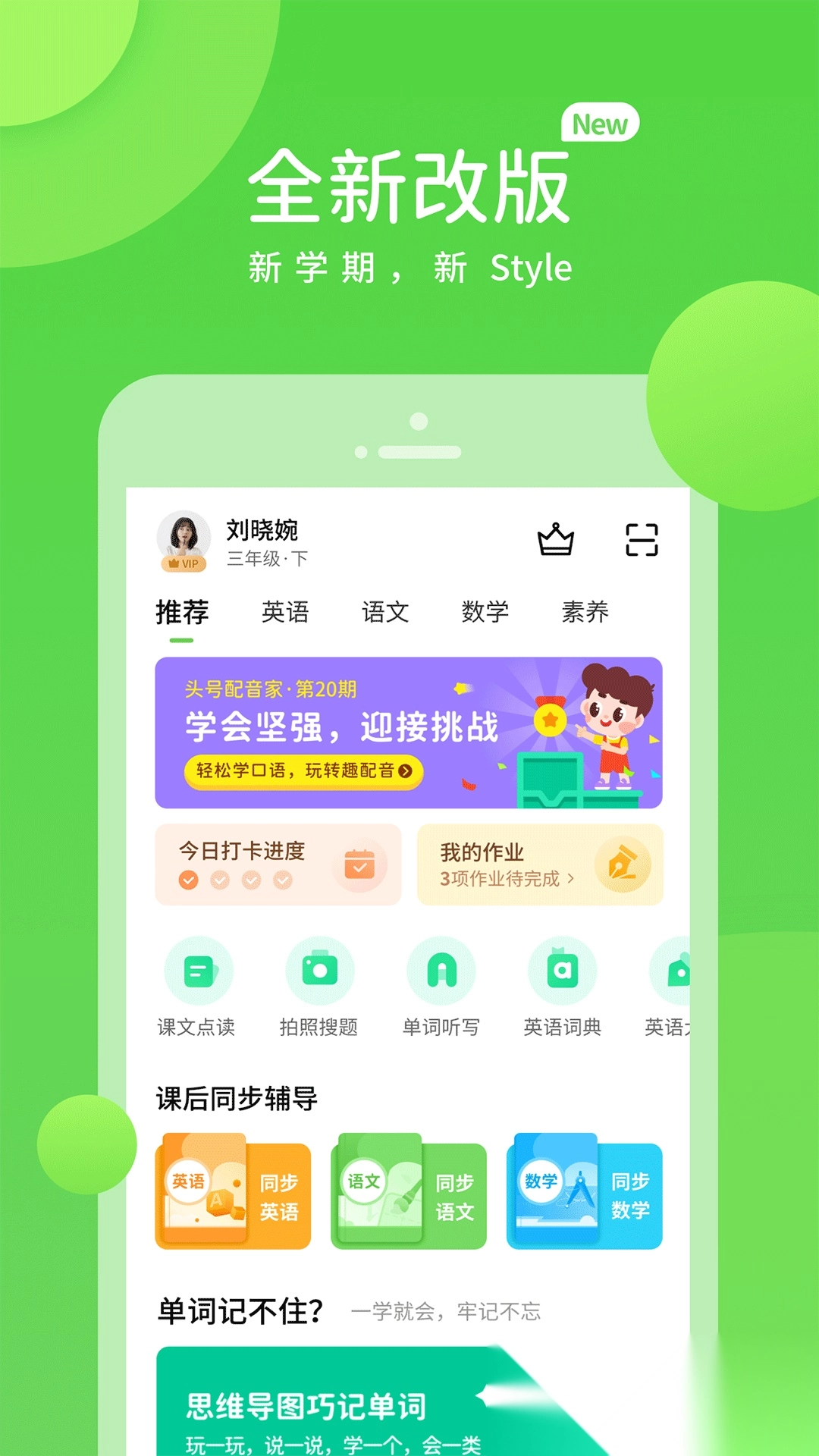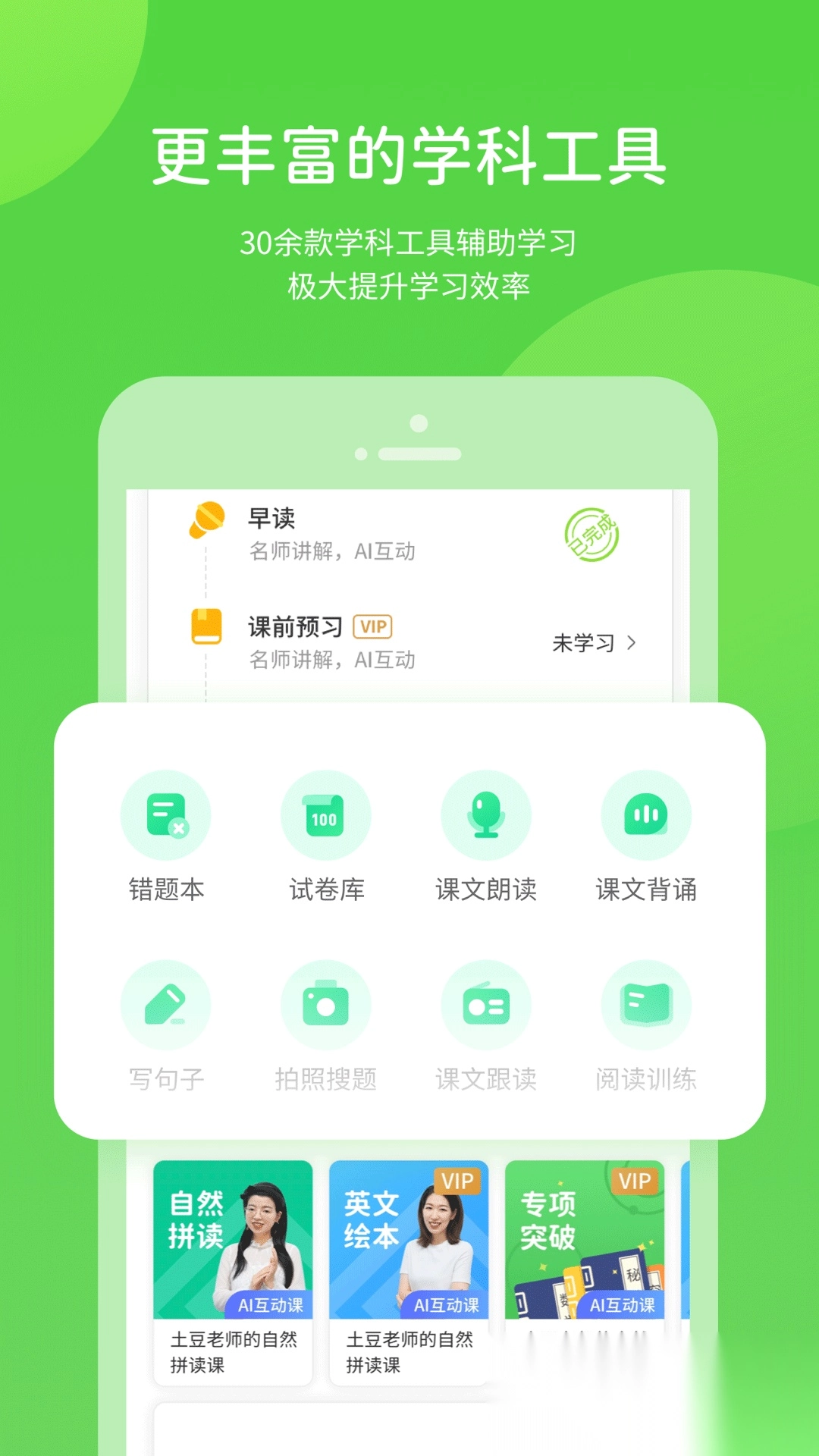 课文点读:与教材内容同步的点读及配音功能; 2. 课内同步学:由名师精心打造的课内同步AI互动课程,覆盖小初高全学科的同步辅导; 3. 学科工具:30多款学科工具助力学习,有效提高学习效率; 4. 巧考:提供历年真题练习、海量题库刷题,还有名师制作的专项提分课程,帮助快速提升成绩; 5. 教辅书:配套的教辅内容与功能,辅助学生轻松攻克重难点题目,掌握举一反三的能力; 6. 同学圈:可进行签到、参与PK、学习配音绘本、查看同学动态,让学习充满趣味,助力快乐成长。