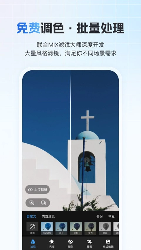 免费批量调色功能,是与MIX滤镜大师深度合作开发的成果,拥有适配不同场景的多风格滤镜。