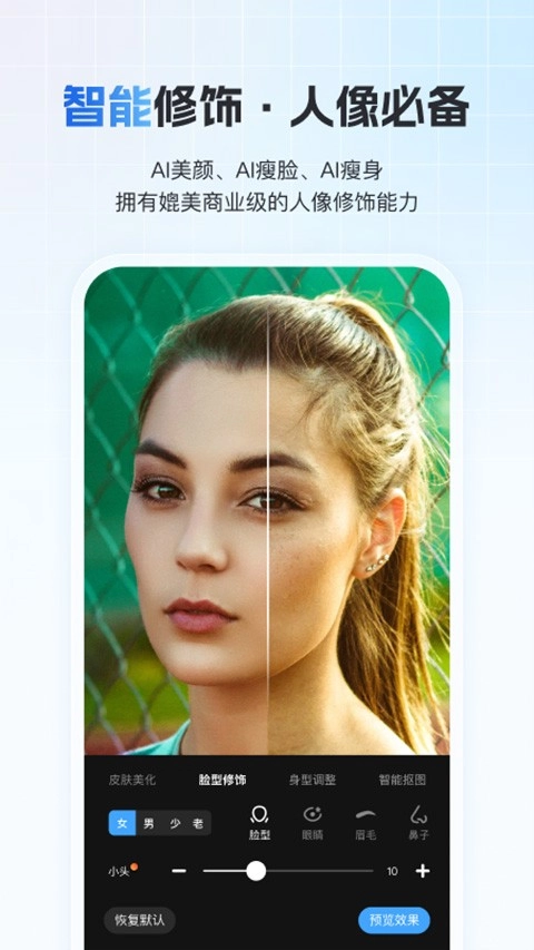 智能人像美化:AI美颜、瘦脸、瘦身,具备可与商业级修饰相媲美的能力;