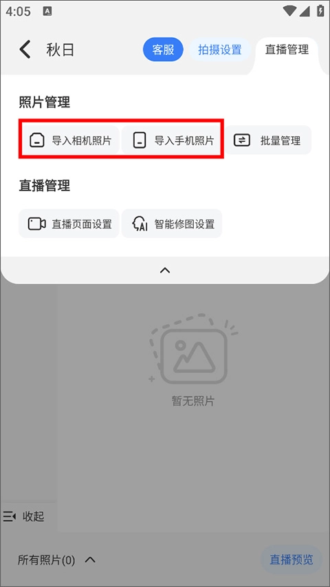 在直播管理界面,选择导入相机照片或手机本地照片;
