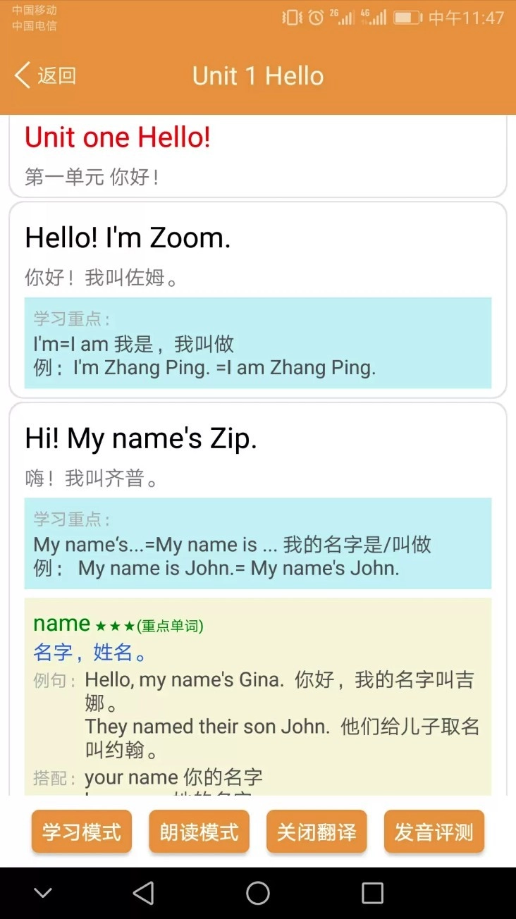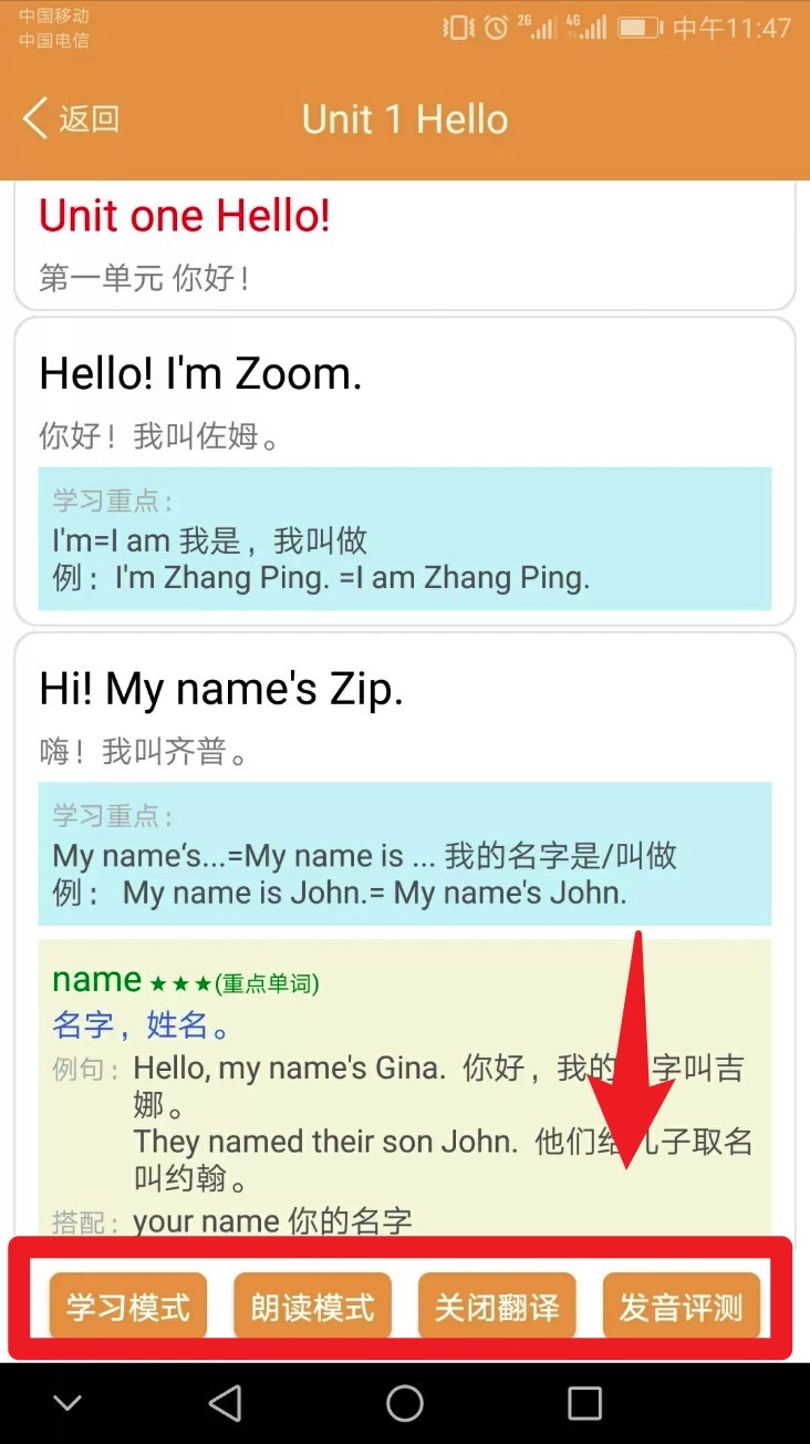 进入课文学习页面后,能够通过切换学习模式、朗读模式、发音评测等不同方式来练习重点句型。