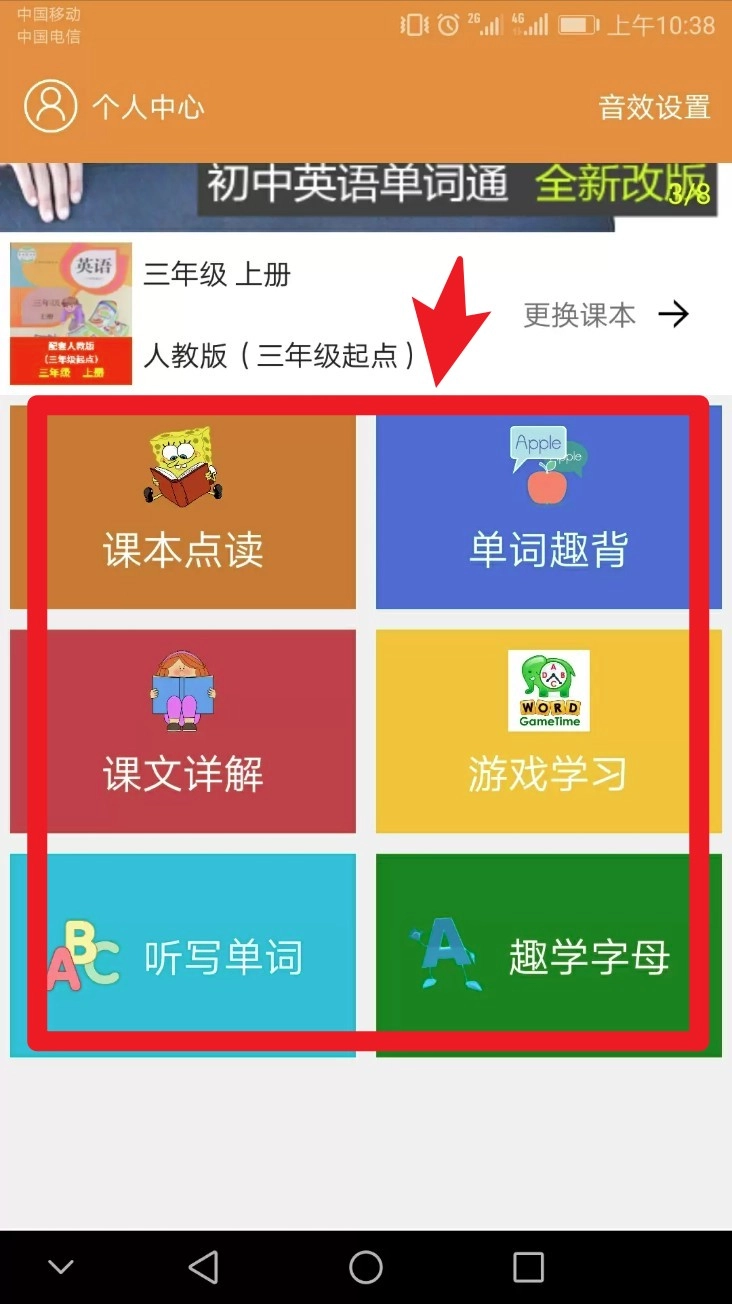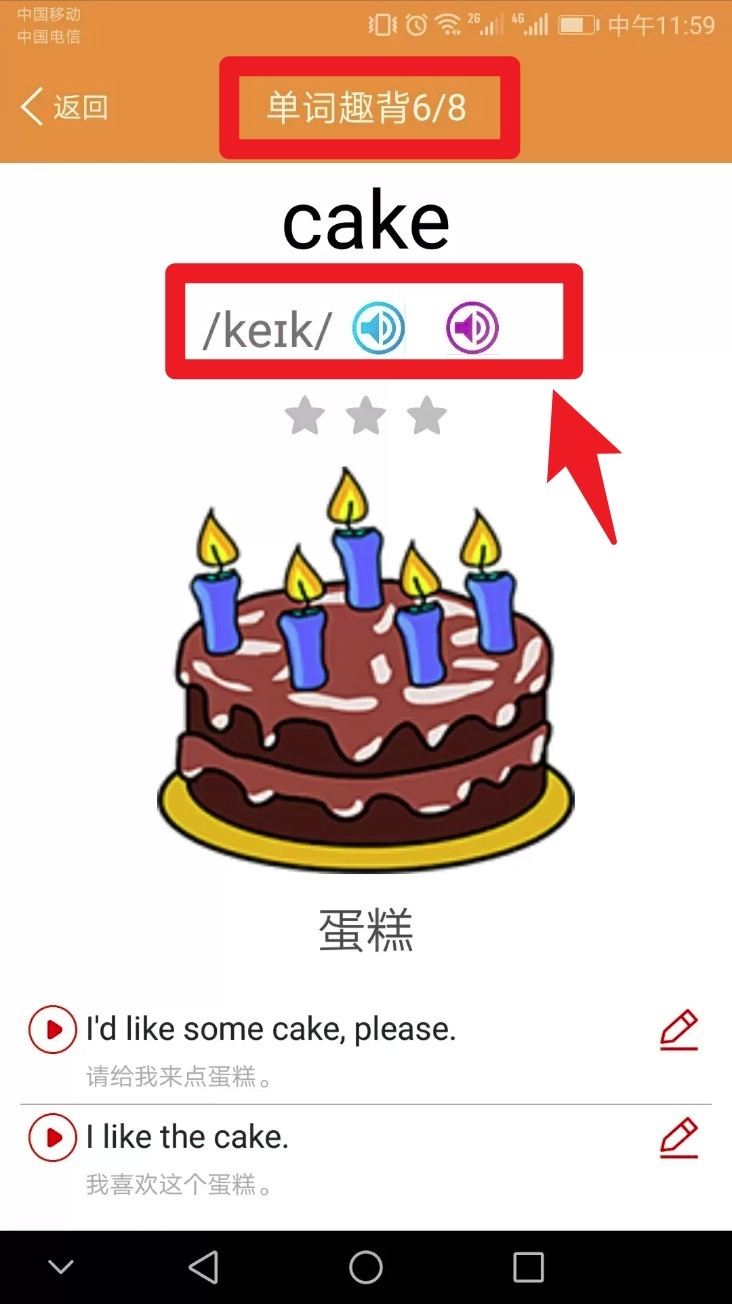 点击单词趣背模块能查看图文结合的单词卡片,点击发音图标可播放标准读音并进行跟读。