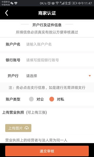 请填写个人或对私银行卡相关信息,包括账户名称(通常是姓名)、银行卡号以及详细的开户支行信息(建设银行的银行卡无需填写开户行),并上传“营业执照”照片。建议点击“递交审核”按钮,之后等待后台处理即可。