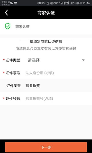 请填写商家认证所需信息,其中商家名称、法人姓名、联系电话、所在地区为必填项,全部填写完毕后点击“下一步”按钮。