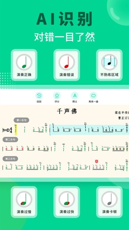 智能陪练功能:依托AI技术对音准和节奏进行实时监测,同步给出纠正指导与练习意见。