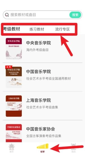 点击底部的练琴菜单,即可进入曲目资源区。在这里,您可以根据考级教材、练习教材或者流行专区的分类来挑选曲目。