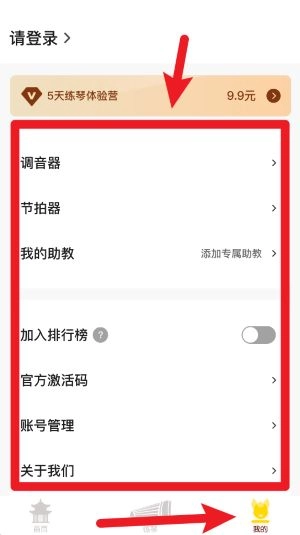 在我的页面里,你可以找到调音器、节拍器、账号管理等功能设置入口,还能参与排行榜以及激活课程。