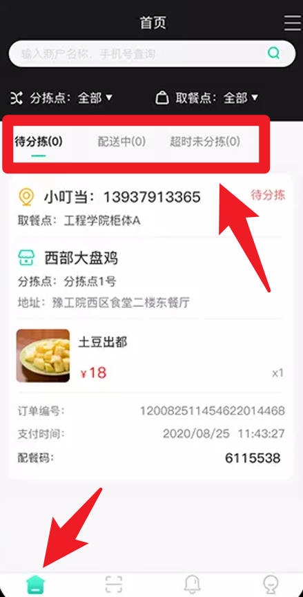 在订单界面能够查看待分拣、配送中以及超时未分拣的订单信息,实时了解订单动态,从而提高配送管理的效率。