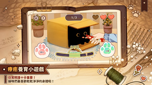 无论是游玩系统设计上,或是剧情,我们都围绕着现实重要的动保议题,有科普养育及医学知识的猫咪小百科,在病灶制作与资讯表达上,也请教了专业兽医师,希望在放松游玩游戏中,能学到对妳现实养育的那个宝贝有用的知识哦!