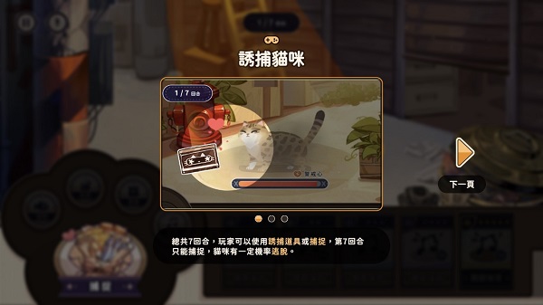 不过流浪在外的猫咪可是非常有警戒心的,我们要利用游戏进行诱捕(总共七回合,可以使用诱捕道具等第七回合再捕捉),捕捉到后如果房子空间不够就只能先让它们到收容所了,还要记得带它回医院做检查喔!