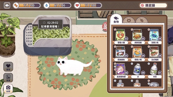 等带回猫咪后还能帮它们取名字。接着从左下角按「饲养」,点击进去后最上面可以看到猫咪的状态,看看你的猫饿不饿,渴不渴还有心情如何,依照猫咪的情况我们就可以将食物、道具或猫砂拖曳到猫的身上,但有时候喂食,主子还不一定会吃呢,毕竟每只猫的口味也是不一样的。