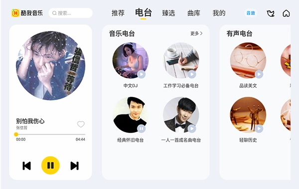 安装完成后,您就能踏入酷我新时代,这里主要设有推荐、电台、甄选、曲库和我的版块功能。