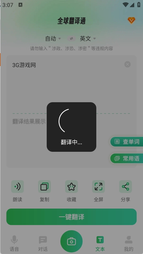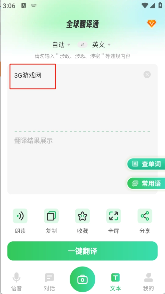 这里以文本翻译为例,在输入框中填入需要翻译的内容,然后点击“一键翻译”按钮。