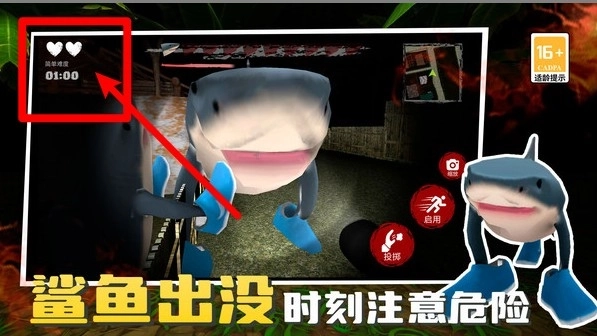 2.右上小地图实时显示房屋结构及逃生路径,留意红色警报标记可预判鲨鱼巡逻方向并规划安全路线。