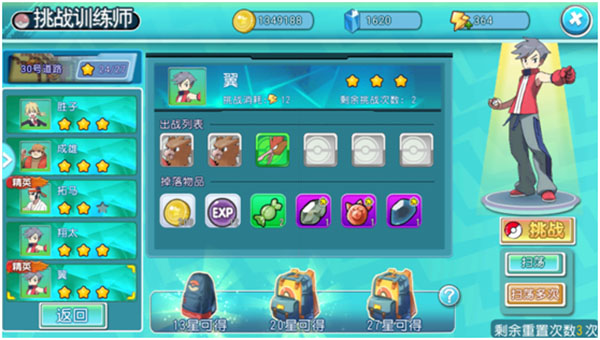 挑战NPC和BOSS获得3星评价,每个地图累计达到相应星级即可获得关卡奖励。挑战分为普通和精英关卡,挑战3星后即可通过一键快速扫荡获得奖励。可以获得精灵升品所需的精灵卡牌和进化需要的进化石,也能获得大幅的角色经验。