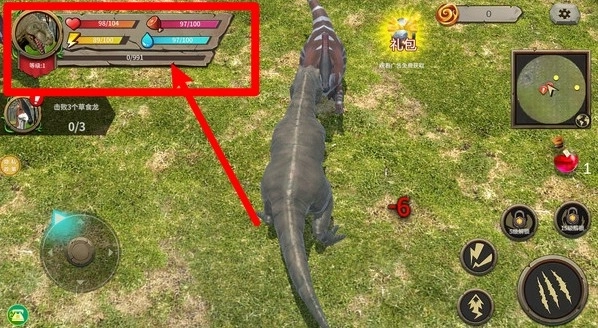 2.左上角状态条显示当前霸王龙的血量、饥饿值和能量值,三者都需要关注,避免因饥饿或虚弱影响作战效率。